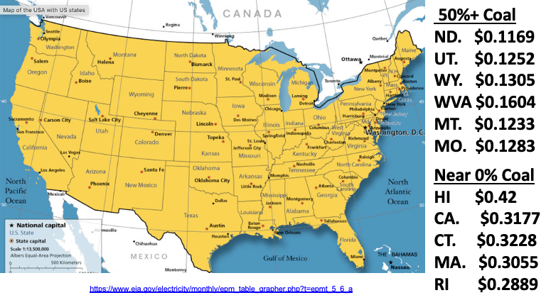 Coal power plants have proven to be the lowest cost producers of electricity in the U.S. Where coal plants have been shutdown, such as CT, MA, CA and Hawaii the electricity costs are the highest in America. Where coal plants continue to operate such as UT, NE, MO, WVA the electricity prices are the lowest