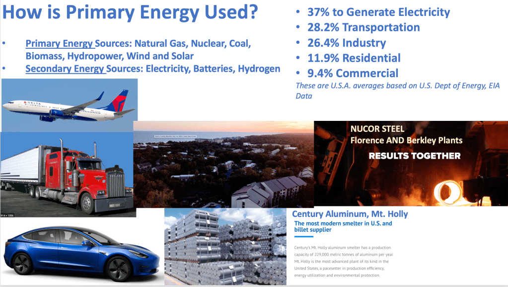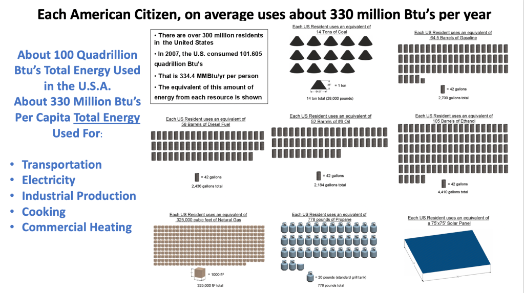 The highest use of energy in the U.S.A. is for electricity production at 37% of our total. Next is transportation at 28.2%. When all uses of energy are totaled in Btu equivalents, then divided by the population, the average comes out to about 330 million Btu’s per person per year. This includes all uses of energy.