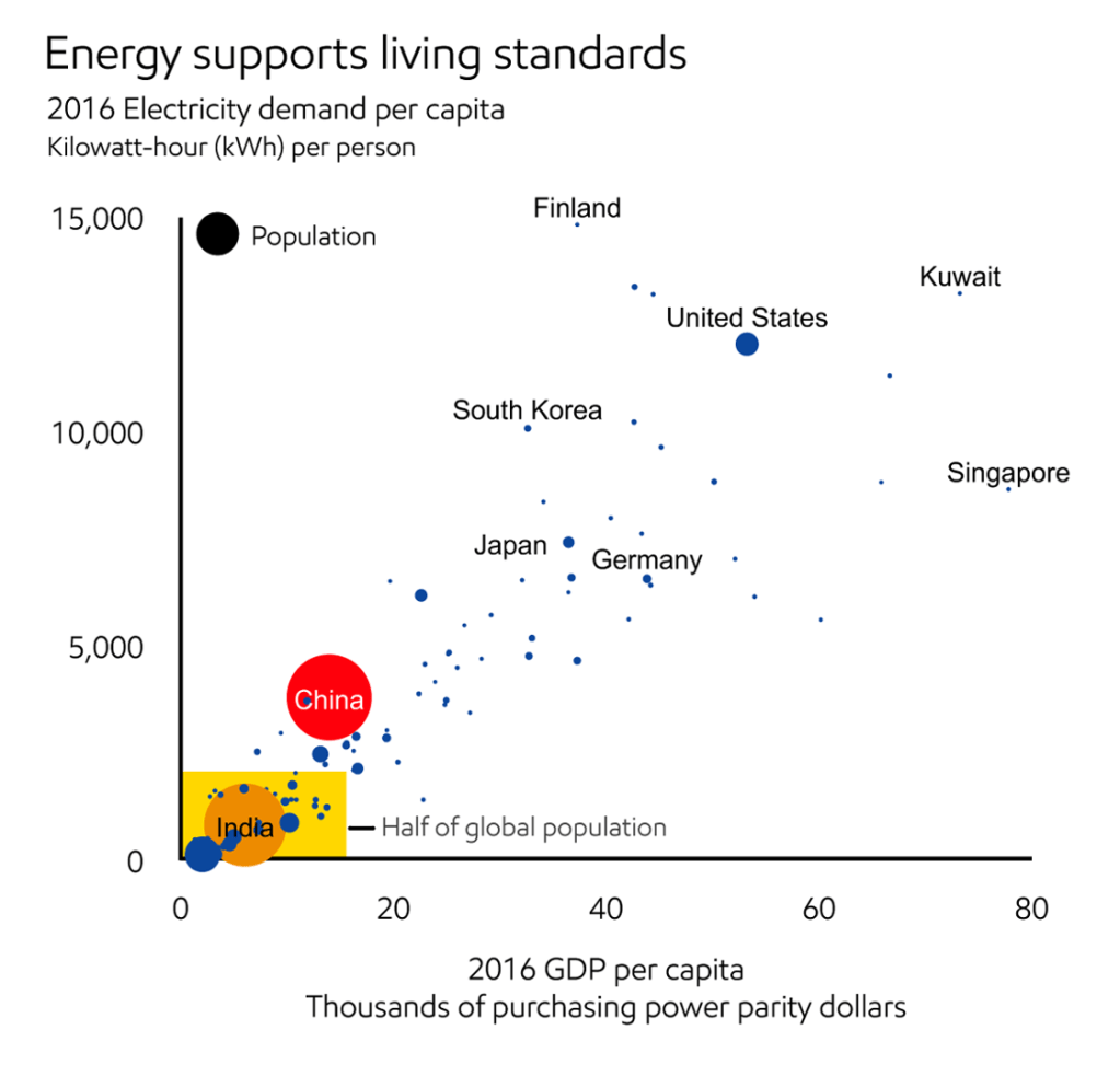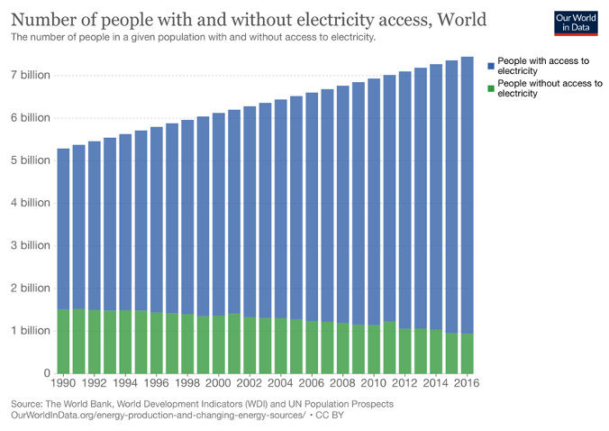 The next graph is from ExxonMobil’s Outlook for Energy and uses data from the U.N., World Bank and other respected references. Note the vertical axis showing energy use in kWh per person/year. Over 50% of the world’s population uses less than 2,000 kWh/year. Americans on average use about 13,000 kWh/year. The electricity is used for residential heating, cooling & cooking. Keeping it into perspective, nearly 1 Billion people of the world do not have access to any electricity. Note the chart which follows, below. This data from the UN, World Bank and the chart was prepared by “Our World in Data”.