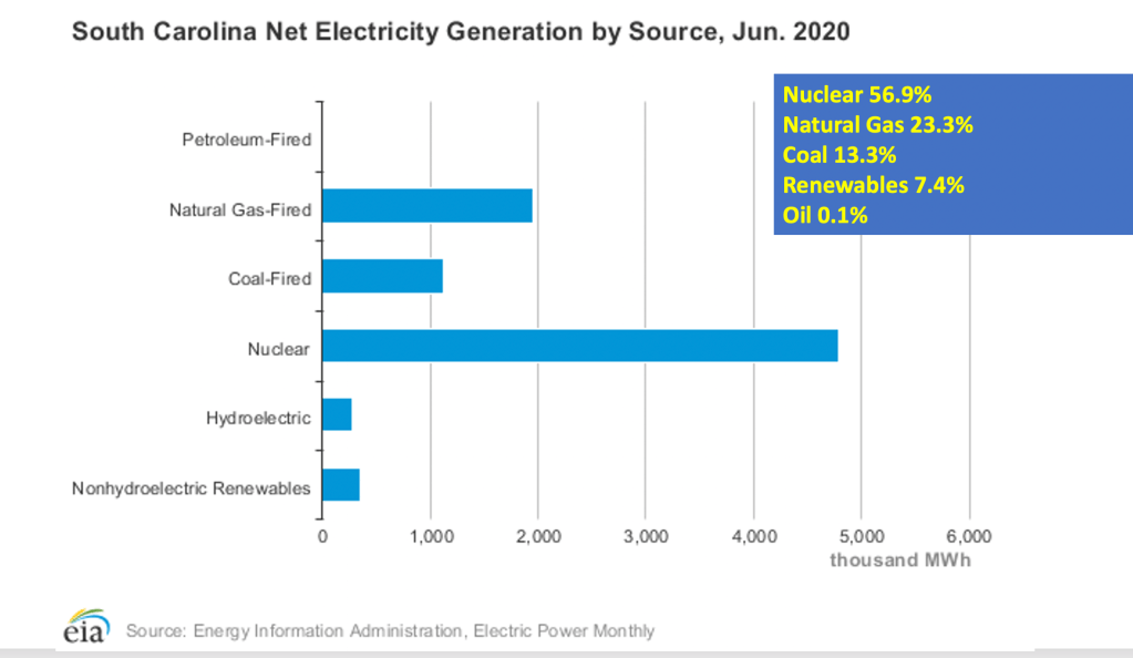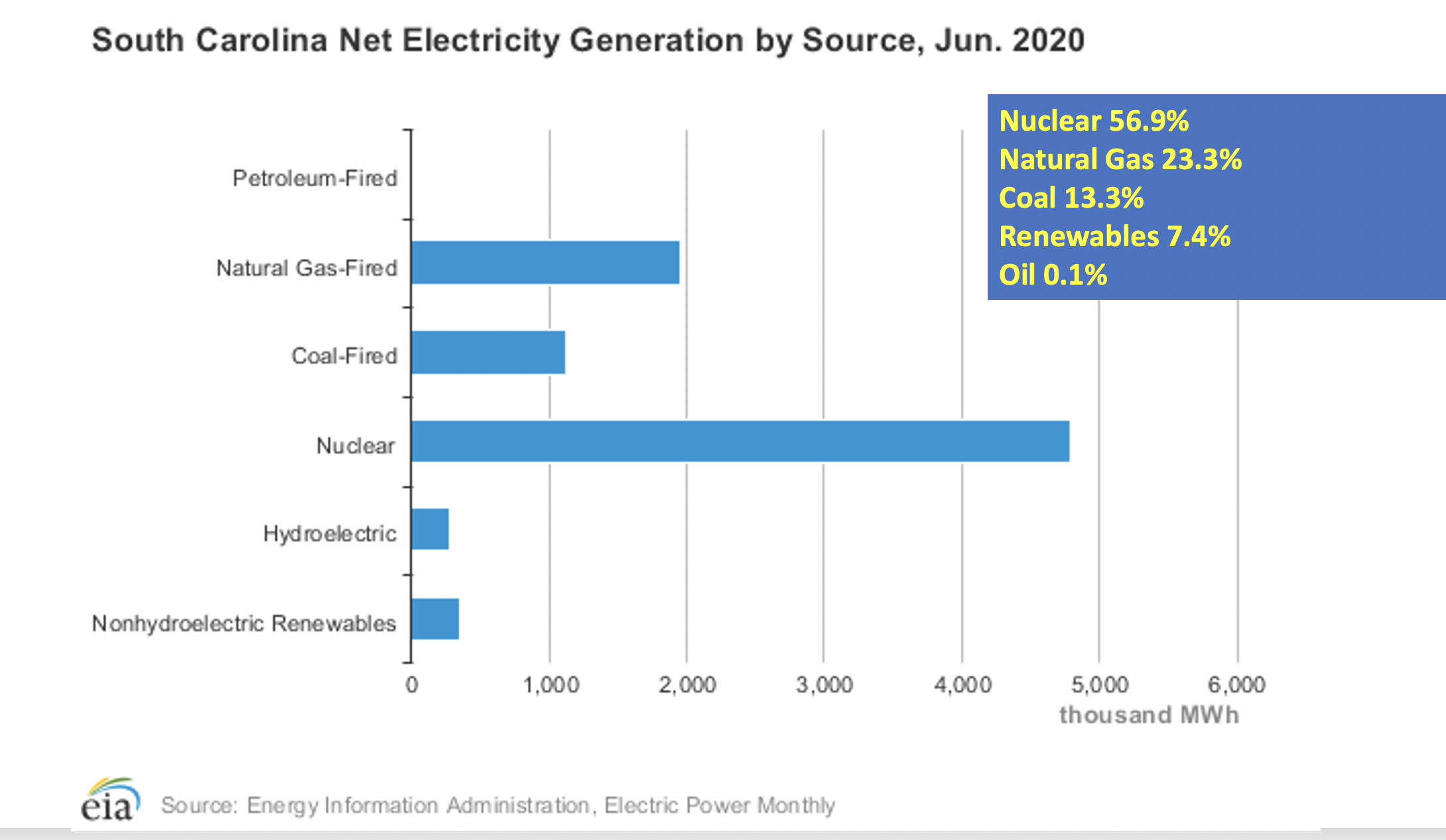 During the years 1978-2012 I traveled the world working as a consultant to ALCOA. I saw as the expression goes, “Like a fly on the wall” the decline in ALCOA’s aluminum production as China dumped millions of tons of metal into world markets. Yes, they are over 50% of the world’s production capacity. Being competitive matters to every one of our 50 states, but here in SC (and every other U.S. State) it is particularly important to continue generating reasonable cost, reliable electric power. How does SC do that? It may surprise a lot of folks, but SC nuclear power generation is number 3 in America and provides over 55% of South Carolina’s electricity. In 2019 56.9% of SC’s electricity was generated by nuclear power. Of course, that helps both the clean air and reasonable cost generation factors.