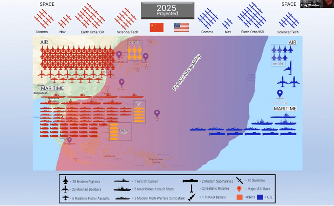 So, if I get back to the matters of manufacturing, energy and economic prosperity, then a picture can be drawn of the rise of Chinese influence and control and the reduction of American influence and control. The economic piece of the aggression is ceding of the western Free World’s Manufacturing might to China. In doing so, it provides a revenue stream to fund their military buildup. One estimate of the projected military resources in 2025 is shown below. The red images of planes, missles, ships, submarines are China’s. The blue represent America’s.