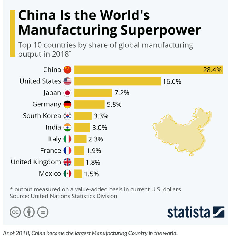 I voted for and support President Trump for reelection in 2020 because, I see him as the first President in recent years to recognize and act on reversing the De-Industrialization of America. The graphic below shows the ranking of world manufacturers. This in itself is not troubling. However, as you read later in this document, the rise of China may not be done solely for Humanitarian purposes and to lift 1.5 billion chinese from poverty. The Chinese 100 year plan 1949-2049 serves the CCP First.