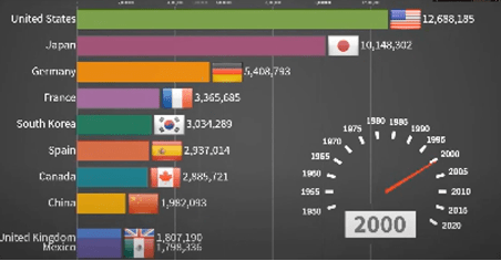Then, by the year 2000, China progressed to rank #8 manufacturing just short of 2 million vehicles per year and more than the UK.
