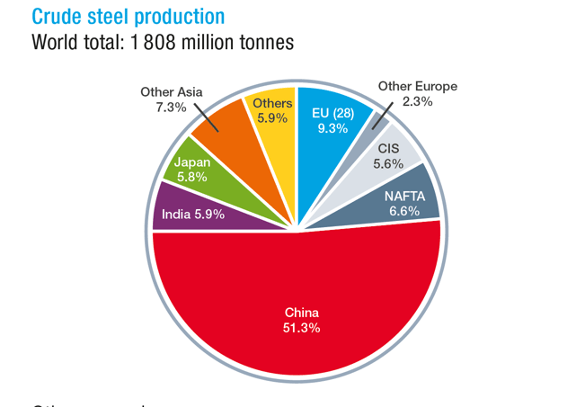 Below is the World Steel Association report from 2018 steel production. (World Steel Association: https://www.worldsteel.org/steel-by-topic/statistics/World-Steel-in-Figures.html)