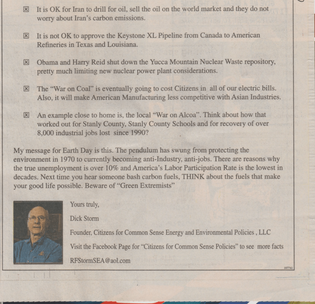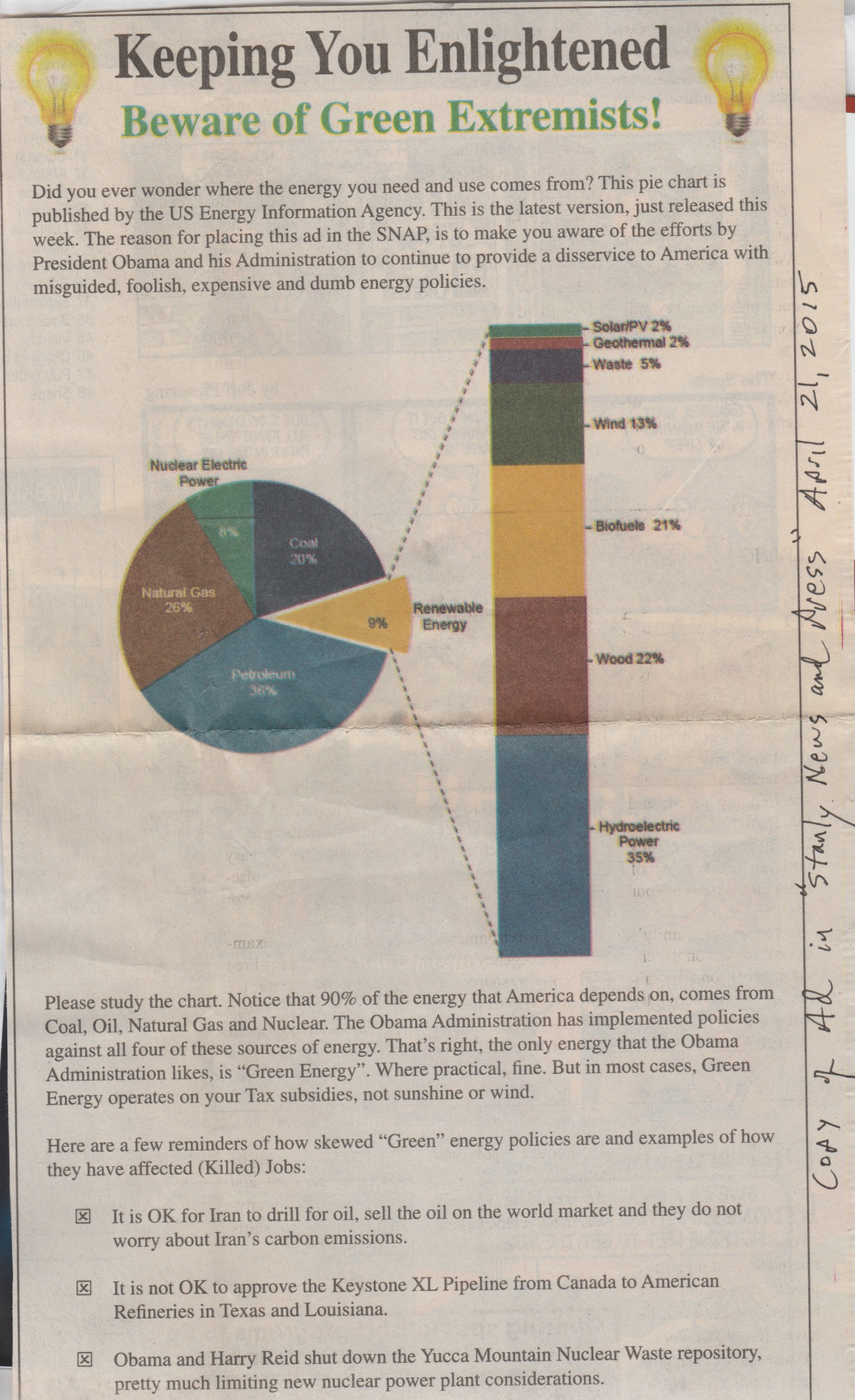 I came across the ad below which was a paid ad, published April 21, 2015, Some things do not change very much regarding where we get our energy and how we use it. At the time, I was living in NC and I was very concerned about the anti energy, anti-nuclear policies of President Obama. Also, jobs in Stanly County, NC (about 30 miles east of Charlotte, NC)