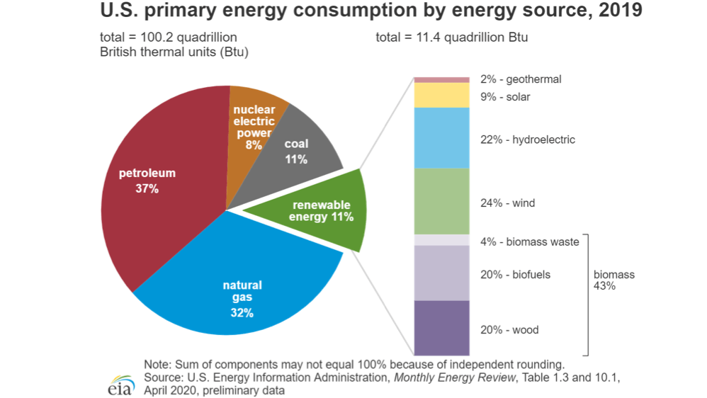 Notice the PIE Chart from the EIA in 2015 which represents the full year 2014. Compare that to the EIA Chart for energy sources in 2019 below: