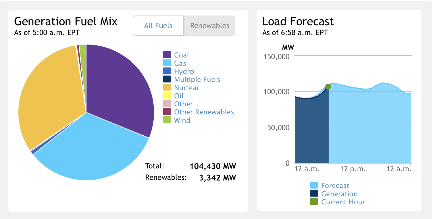 I thought it might be useful to show where our electric power comes from when we need it today. A case in point is the PJM Interconnection which provides electricity generation control (like the FAA provides Air Traffic Controls, PJM provides electrical Dispatch controls for most of the northeastern U.S.A. from New Jersey going west to Chicago. Today is a cold day in Philadelphia and there is not a lot of wind and at 0500 AM zero solar. So, where is the power being generated? Here is a real time chart which was available on the PJM.com website. This shows generation by fuel. Note that about a third each is nuclear, coal and natural gas. Out of 104,430 MW’s being generated only 3,342 MWs are from Renewables. This is 3.2% of the 104,430 MW’s being used (needed) this morning.