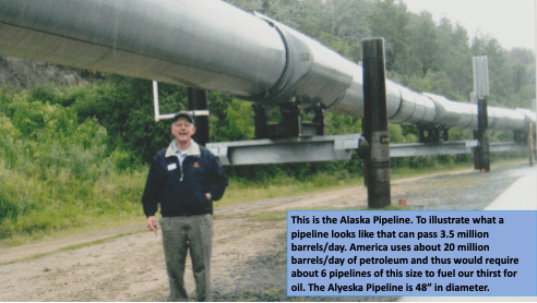 Here is a picture of the Alaska Pipeline. I show this because it is useful to illustrate the amount of energy America depends on each day. About 20 million barrels per day is what America uses in oil. That is used mostly for vehicle transportation, Jet Fuel and industrial output. The Alyeska pipeline passed about 2.2 million barrles per day on it’s most productive year, 1988. So, picture ten pipelines like this to represent the U.S.A.’s oil use. The Keystone Pipleine is rated at 830,000 barrels per day or less than half of the flow in one 48″ diameter Alaska pipeline.