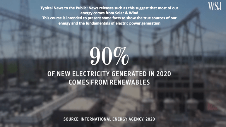 Here is a screen shot from a wsj video on the rise of Renewable Power Generation. Usually, the wsj is a factual news organization. I must admit, it is true that 90% of the NEW Generation in 2020 was Renewables, but still this is only a small percentage of the total (about 3.7 % of 1,000GW of total generation capacity). As the above data from PJM shows, 3.2% by renewables, the EIA data for the entire year 2020 was about 3.8% total energy from renewables.