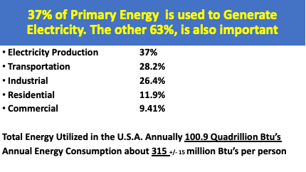 Each of us use about 300-330 million Btu’s per year on average. Whether it is coal, natural gas, nuclear, jet fuel, gasoline, Diesel, hydroelectric, Biomass, wind or solar. We depend on this much energy for our life styles, transportation, comfort, cooking, heating, convenience, manufacturing, commerce, mining, manufacturing and National Defense. Think about the importance of energy in your life.