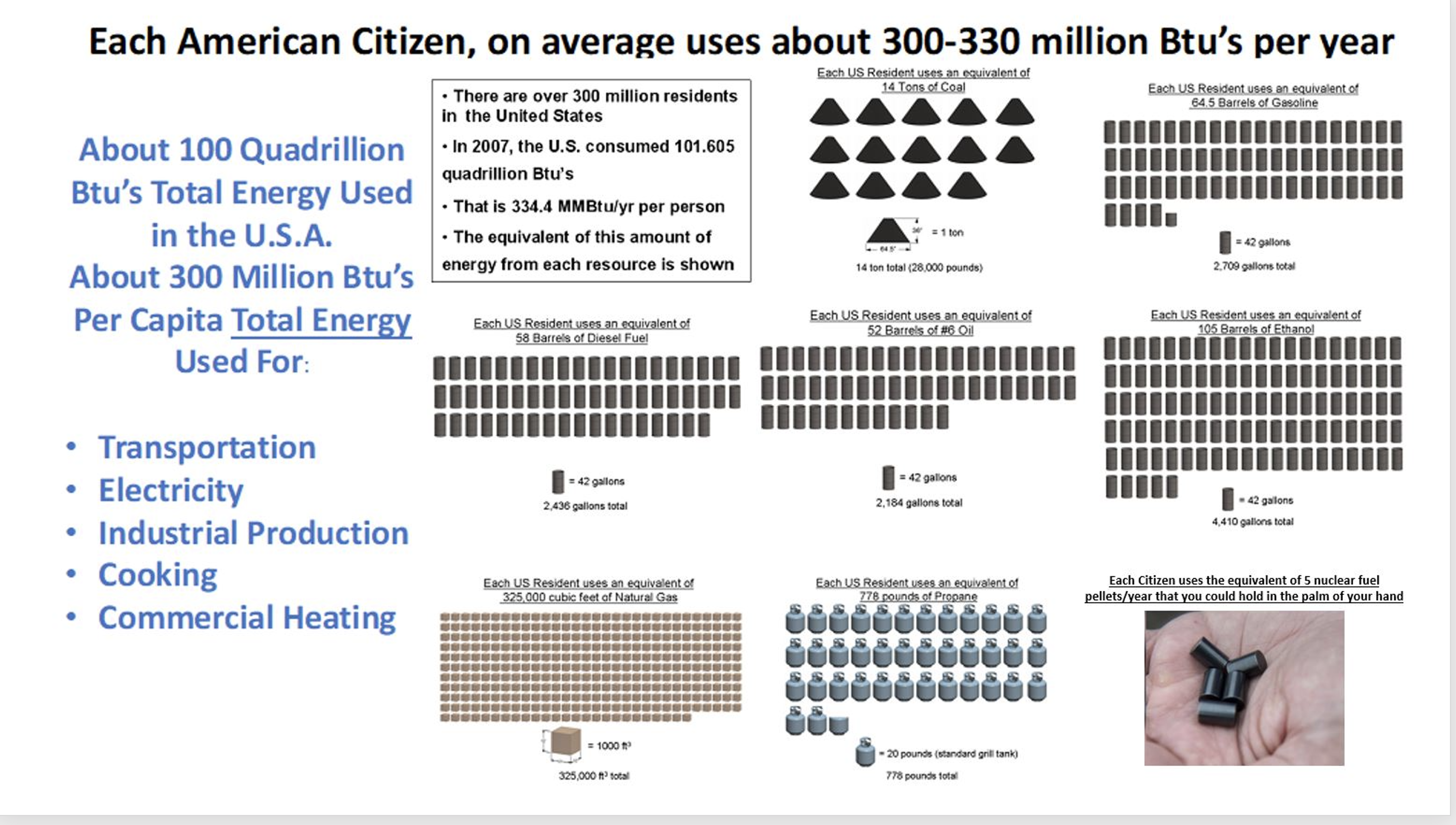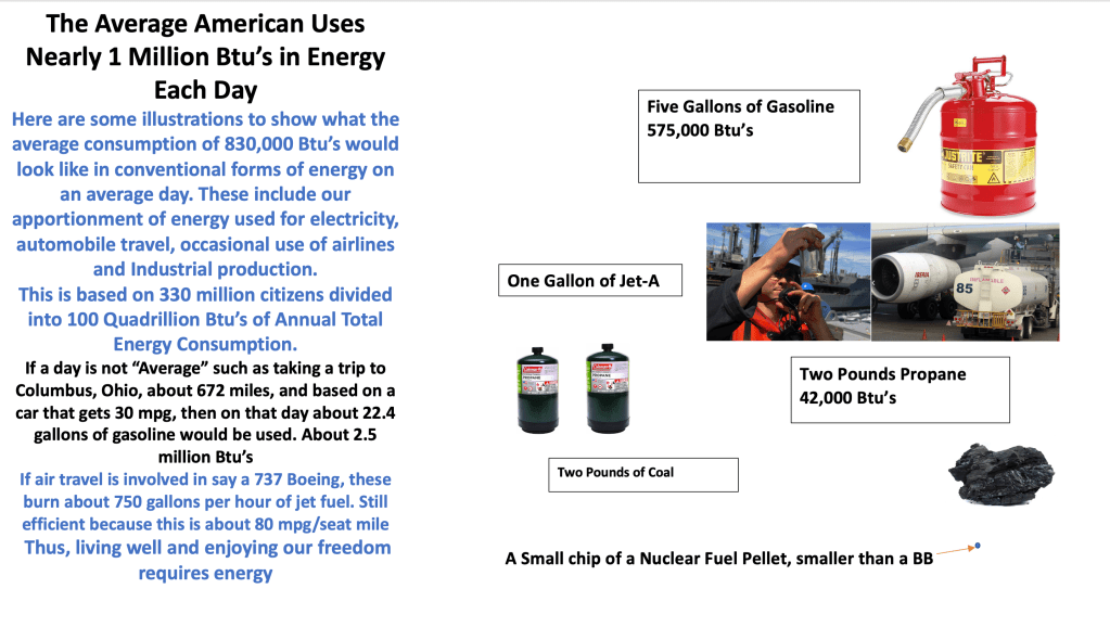 Where does the 830,000 to a million Btu’s per day come from? If we divide 100 Quadrillion Btu’s by the population of 330 million, then the per capita energy use is about 303 million Btu’s/person/year. Divide the 303 million Btu’s per person/year by 365 days and it comes out to about 830,000 Btu’s/day/person.