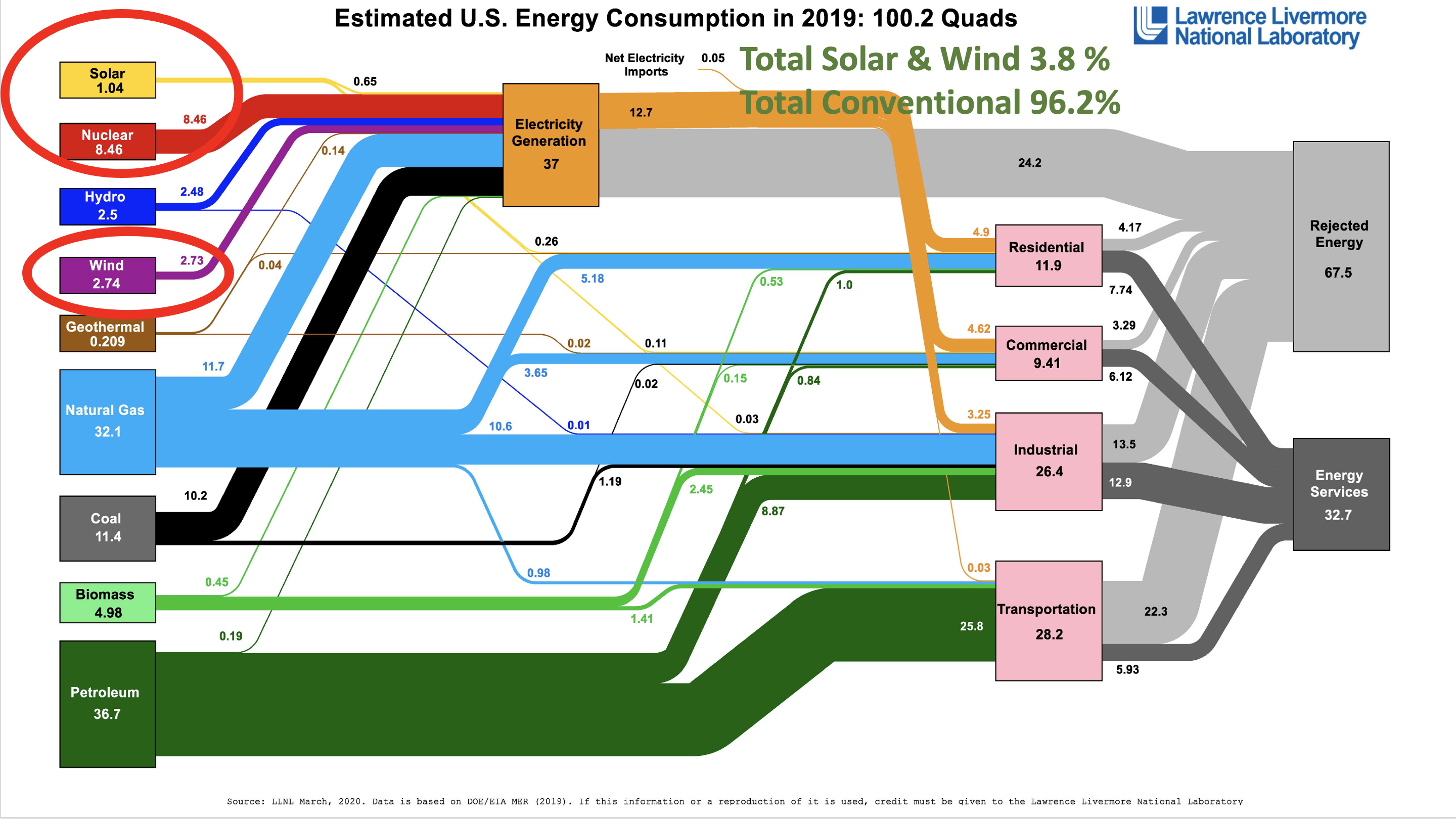 So what does this have to do with the “Green New Deal” and the Clean Energy Plan Congress is about to pass? Well, if we are accustomed to living productive lives using conventional energy sources such as outlined above, then how can we sustain our high quality of lives by substituting wind turbines and solar panels for the 96.2 Quadrillion Btu’s provided by conventional forms of energy? Note that on the first figure above, the Sankey diagram I have inserted the total wind and solar in 2019 provided 3.8% of our energy. Petroleum, natural gas, nuclear, coal, biomass, geothermal and old hydropower dams provided the other 96.2%