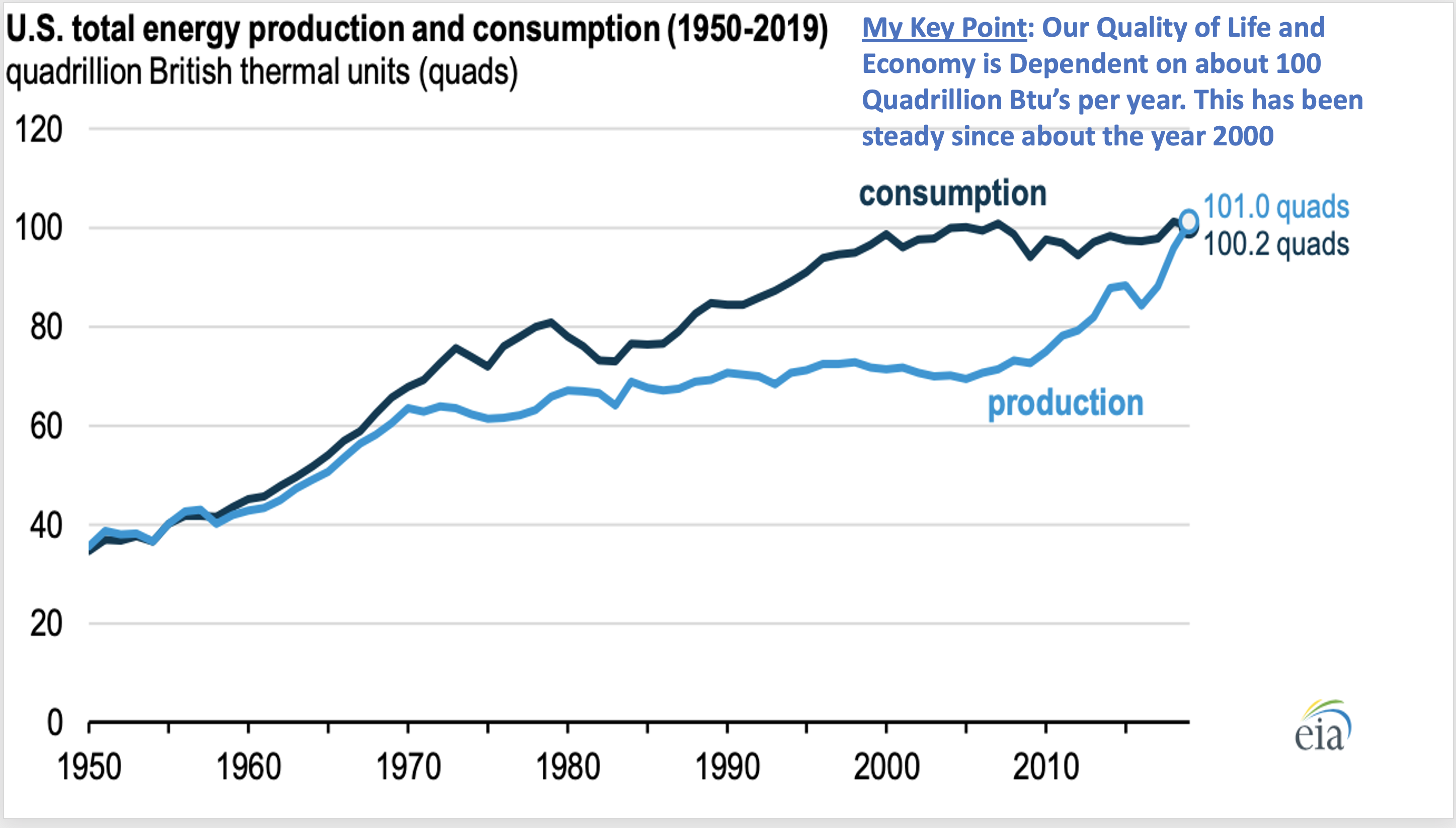 Congress and our President are in the process of forcing Net Zero Carbon, Green Energy on all of us. In my view what this will do is increase prices of energy, make our energy less reliable, make America less competitive and in general, harm our quality of life. In thinking about this and attempting to explain why I feel this way, it occurred to me that if all of the citizens knew where our energy comes from and how much we depend on it each day, perhaps more of us would pressure our Congressmen/Congreswomen to resist this foolishness. So, here is my stab at explaining where our energy comes from and why the “Green New Deal” is so harmful.