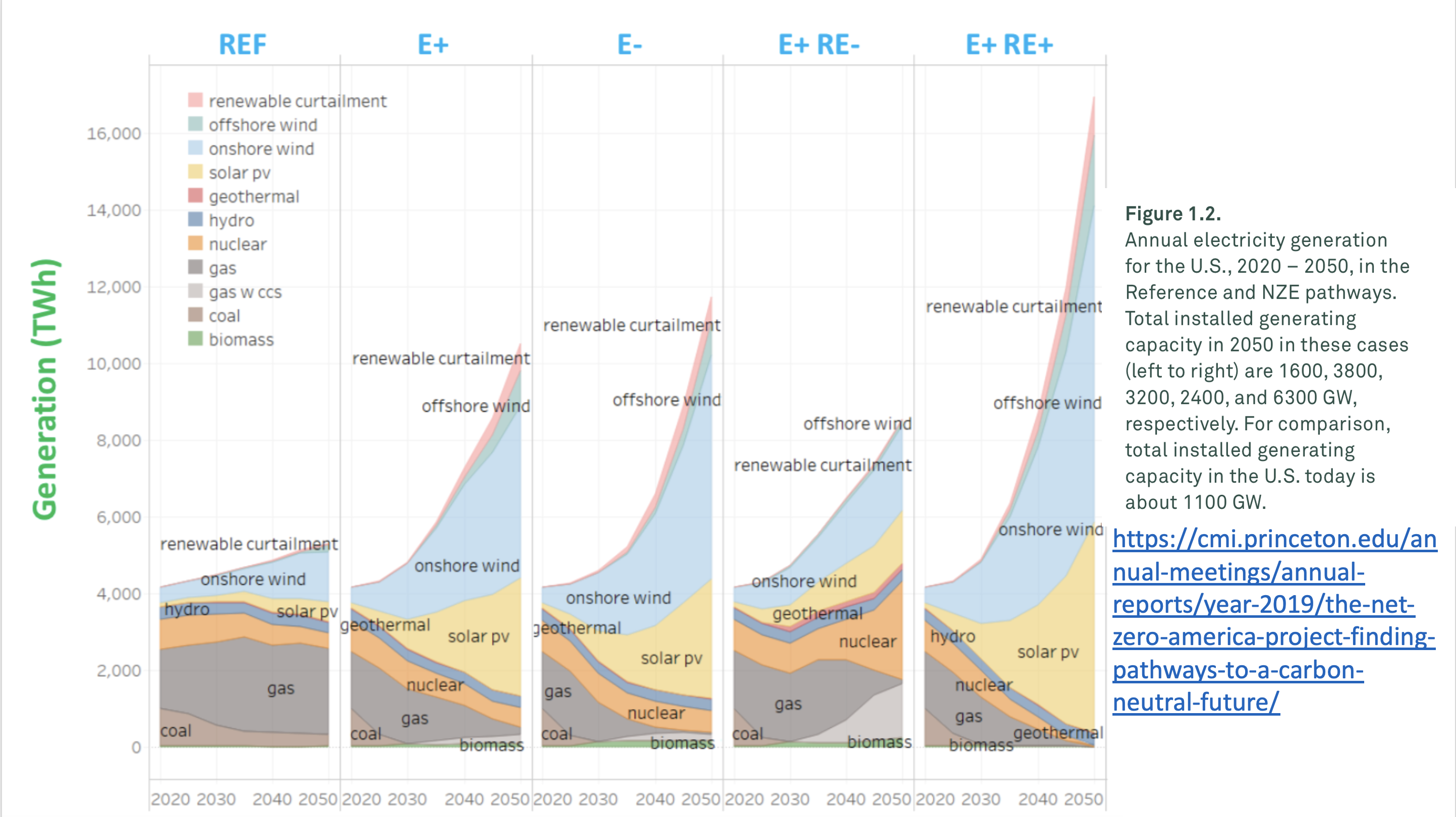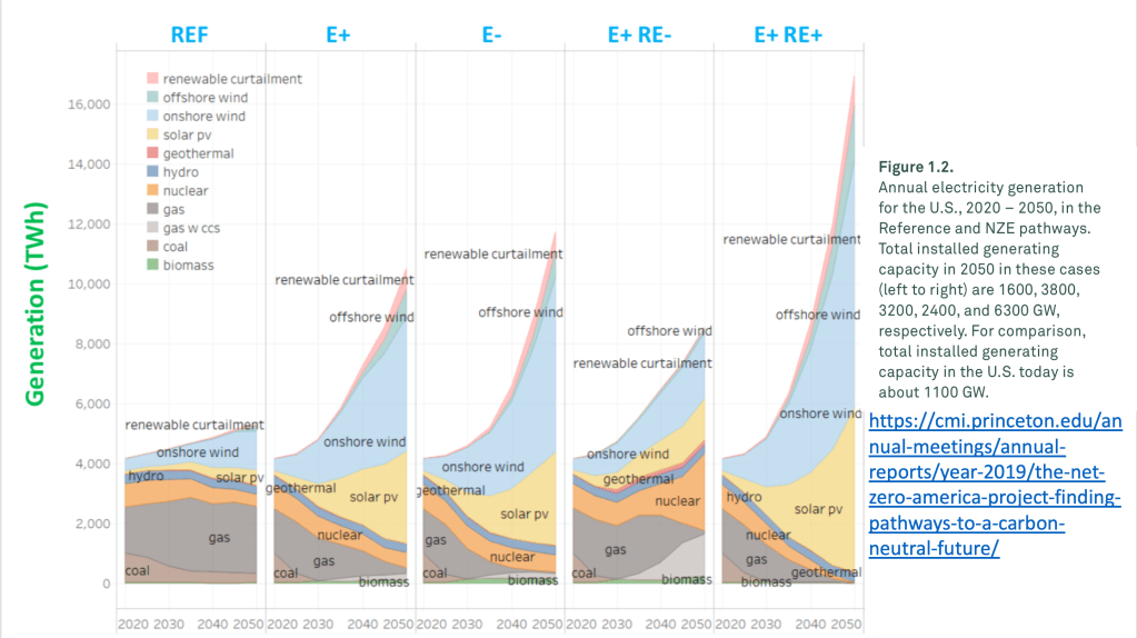 Let’s get to electricity. The total energy used in 2019 was 100 Quadrillion Btu’s and 37% of this was used to generate electricity. So if we look into the future of EV’s and eliminating the internal combustion engine, then the energy used for transportation will need to come from electricity. Lots more electricity. How does the “Net Zero 2050” proponents think they will get to zero carbon emissions? By windmills and solar. Lots of windmills and solar. Here is an illustration from the Princeton University Net Zero Path.