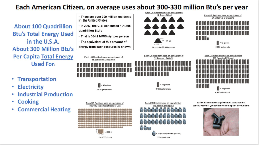How did I come up with 800,000 – 1,000,000 Btu’s per person, per day? Here is how: America uses right at 100 Quadrillion Btu’s annually. If 100 Quadrillion (15 zeros) is divided by the population of the U.S.A. of about 330 million people, the result is about 303 million Btu’s per person. This is the average energy use for each of us. Then, divide 303 million by 365 days per year and it is 830,000 Btu’s per day. The above illustration shows how we may use our portion of fuels to consume our share of the Nation’s energy. If we are traveling by car for an interstate trip, we can easily use more than a million Btu’s in a day. Likewise, ordering a large shipment of furniture or heavy goods from Amazon or other on-line Retailer will require energy to be used on our behalf to deliver our products to the door. You get the picture.