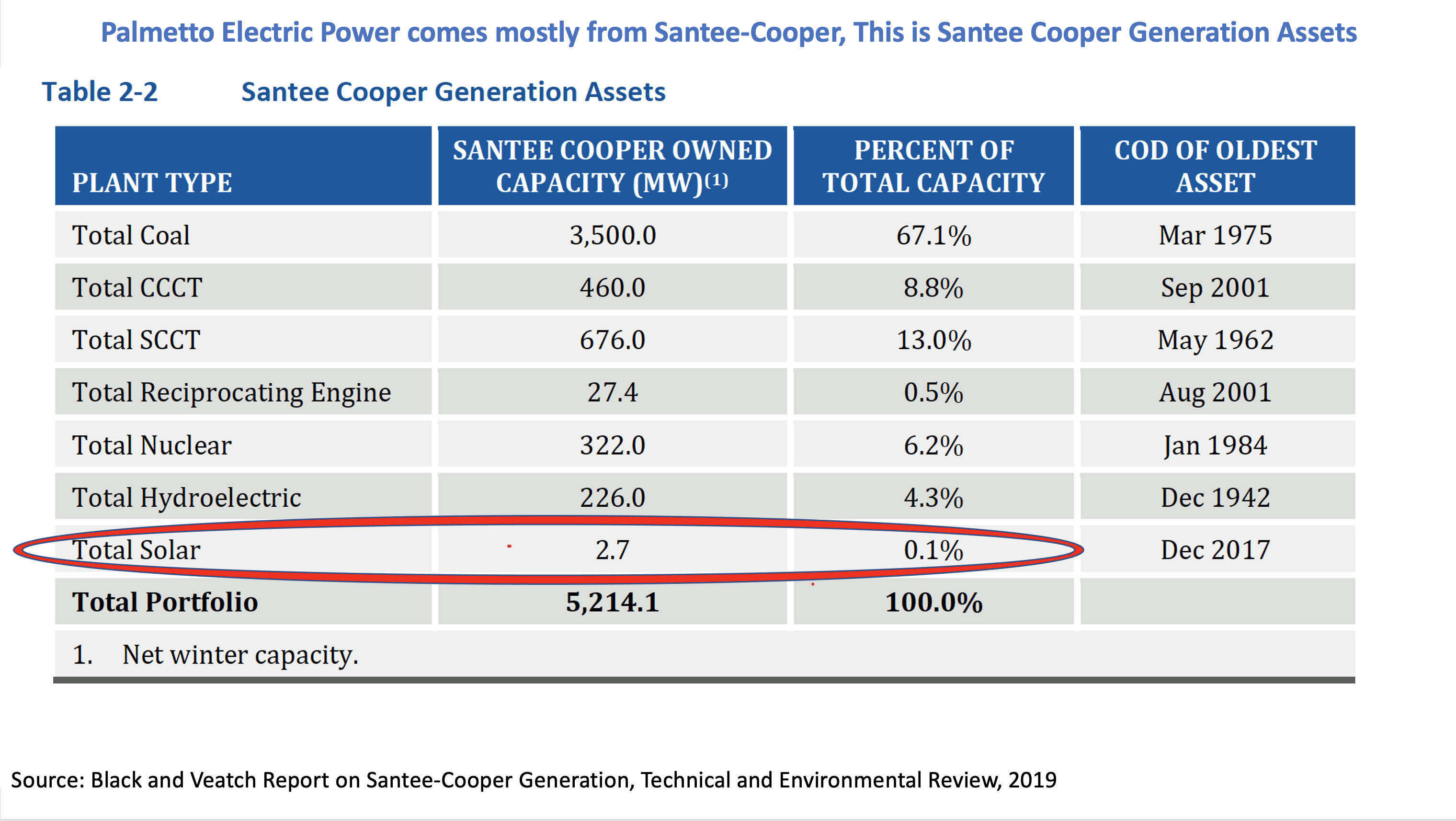 Palmetto Electric Co-Op distributes electricity on Hilton Head Island. They obtain most of their Bulk Power wholesale from Santee-Cooper which is owned by the state of SC. Generation capacity of Santee-Cooper power plants is listed below. Note, most generation capacity is coal, nuclear and natural gas.