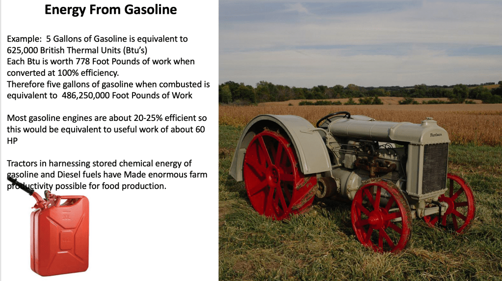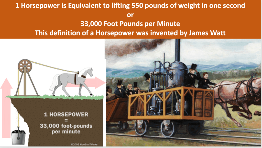 Heat Energy from fuels is enormous. Just a reminder of the definition of a “Horsepower” and a BTU (British Thermal Unit).