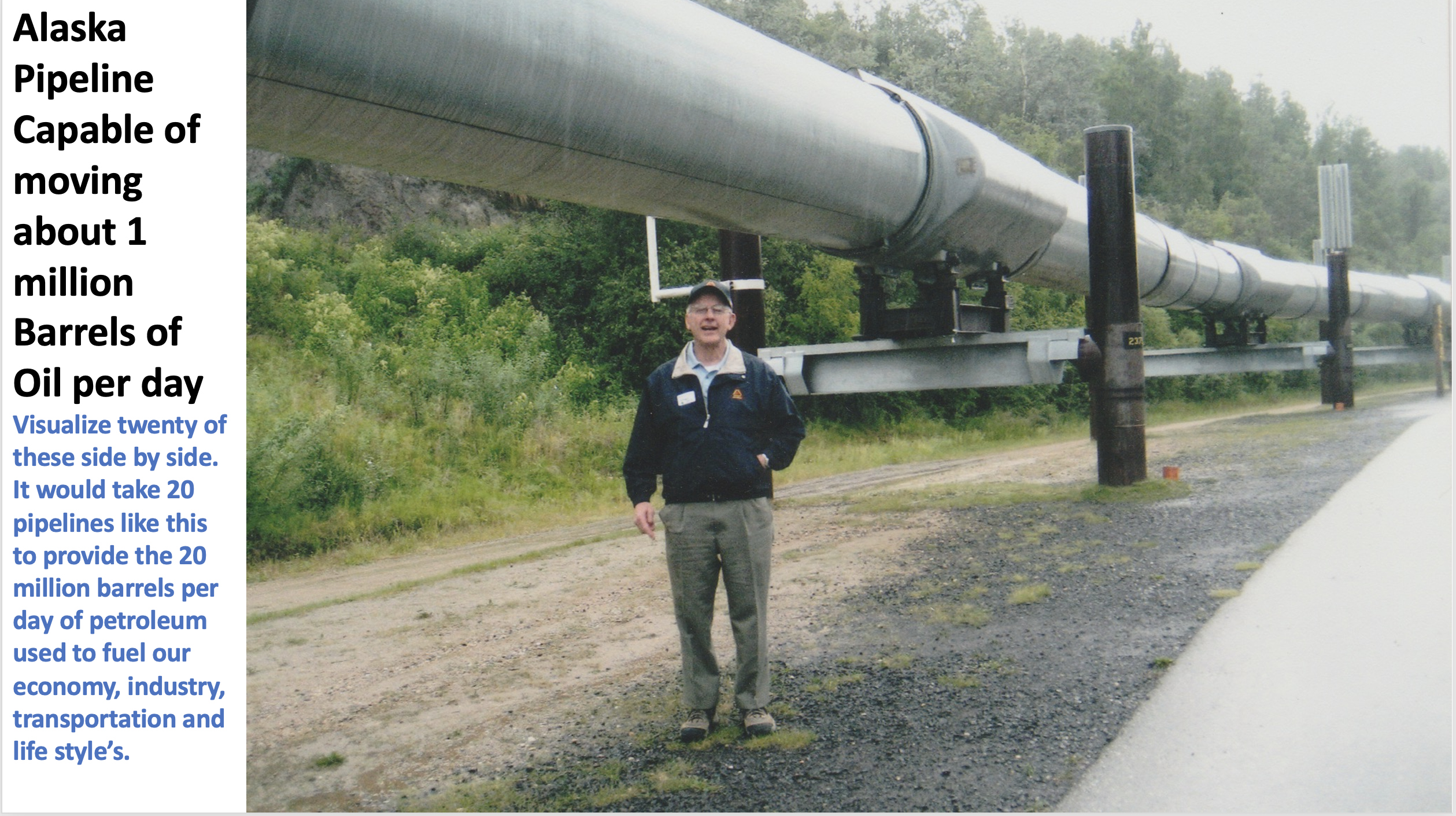 Think about the chart above. Yes, 96% of our Primary Energy comes from conventional sources. (I consider nuclear, coal, gas, biomass and hydroelectric all conventional sources) The highest percentage of primary energy is from petroleum. America uses about 20 million barrels per day of oil. To illustrate what 20 million barrels per day looks like, take a look at the photo below. This is a picture of me standing in front of a portion of the above ground Aleyeska pipeline in Alaska. It is above ground because of passing through frozen tundra and the heated oil must be above ground for environmental and pipeline integrity concerns. This pipeline is capable of moving about 2 million barrels of oil per day. So, to imagine the quantity of oil that America uses, picture 10 of these pipelines side by side. Yes, 10 pipelines like this. At 42 gallons per barrel, that is a lot of oil.(2)