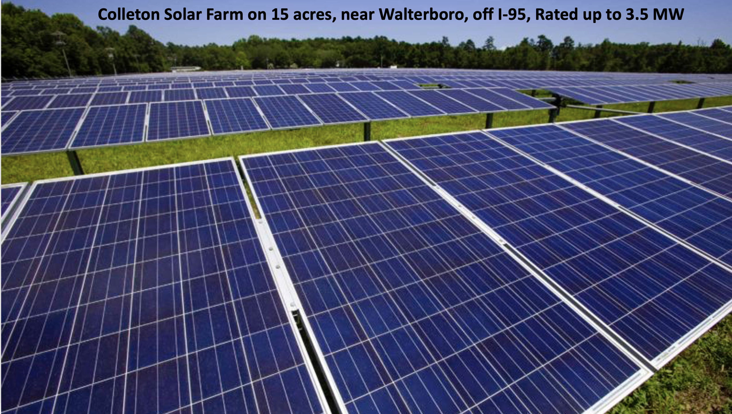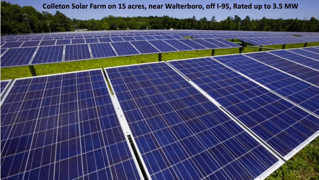Much is written in the news about solar and many people are of the impression that solar is a major source of Bulk Electric generation. The fact is that yes, much money is being invested in solar but the total generation is very small when compared to nuclear, gas and coal. Here below is a much hyped solar farm on the east side of I-95 about 50 miles north of Hilton Head. It is about 15 acres and during a bright sunny day will produce about 3.5 MW.