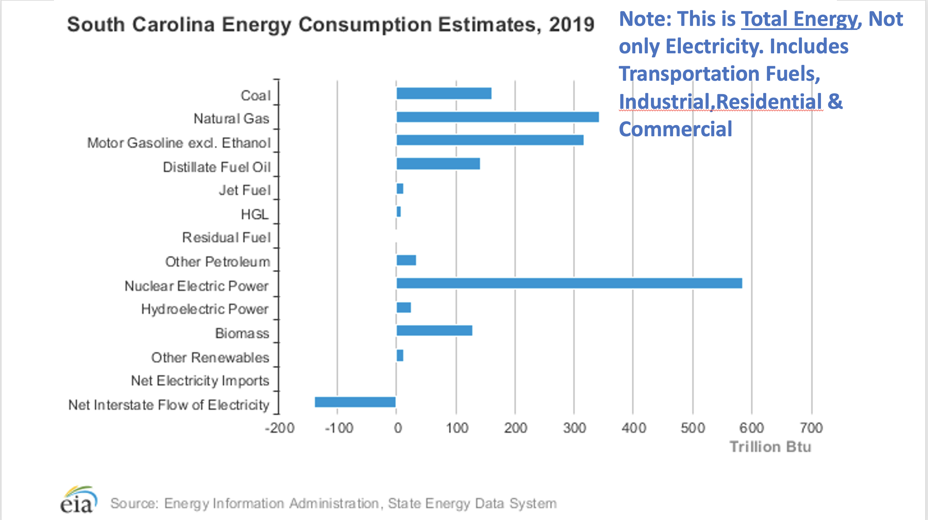 The Santee-Cooper Pinnopolis Dam, Hydro-Electric plant is shown above. When I use the term “Old Hydroelectric plants”, this is where I was coming from. If you look at “Total Renewables Energy” on the Sankey diagram above, you will see that most of the renewable generation is from old hydroelectric plants. In 2019 that was about 2.5% of our total primary energy as compared to 1.04% solar.