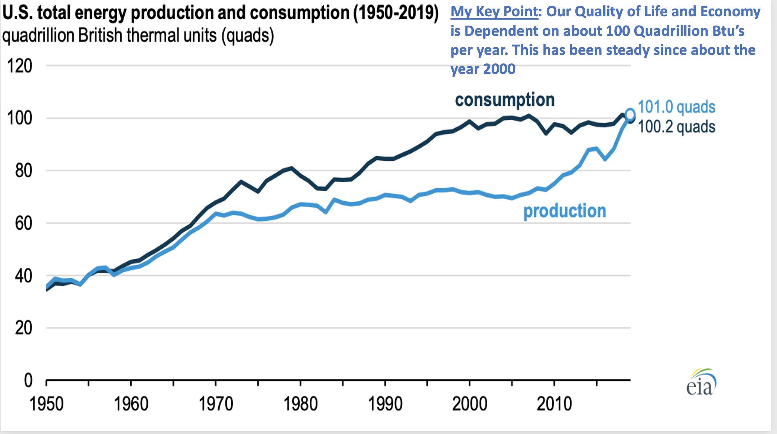 I stated above that the U.S. has used right at 100 Quadrillion Btu’s for decades. The chart below published by the EIA (Energy Information Administration) shows the total energy used 1950 to 2019. The differences in “Production and Consumption” are imports. As of December 2020, America produced as much energy as we consumed. Again, right at 100 quadrillion Btu’s.