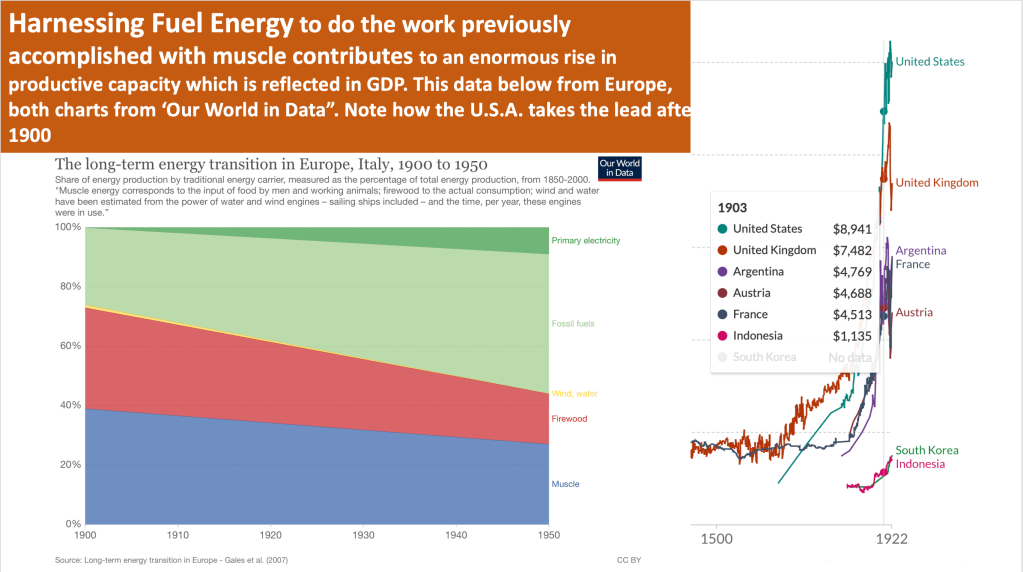A reminder from U.S. history…..Our Economy became the largest in the world as America switched from muscle power of draft animals and humans to mechanization powered by fossil fuels.