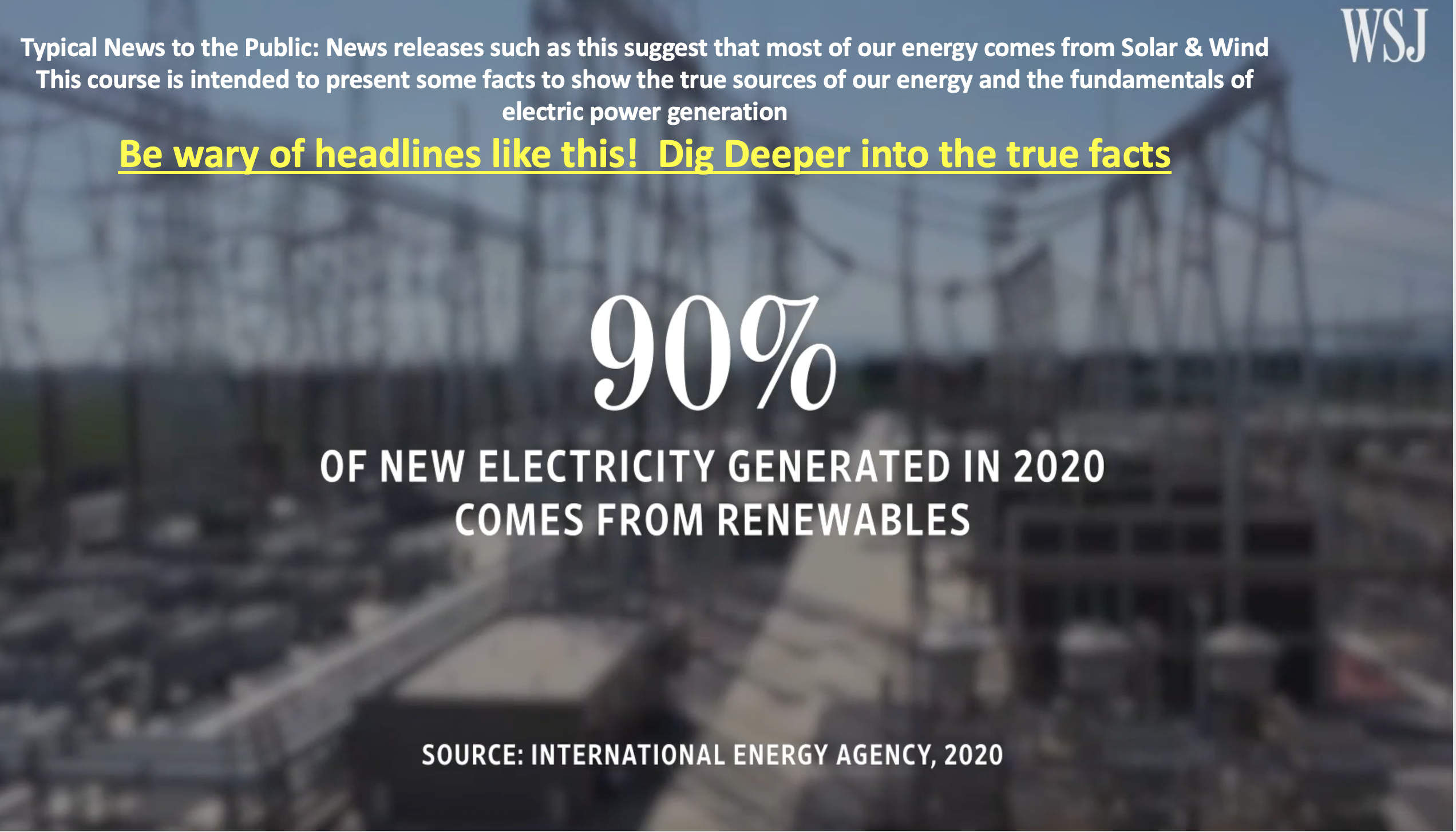 Note that of our total energy in 2019, wind and solar together only provided about 3.8% of America’s total energy. The 96.2% was provided by conventional forms of energy such as nuclear, natural gas, coal and hydro-electric. The WSJ Headline is accurate in stating that 90% of the New Electricity Generation in 2020 came from Renewables. That is because they used “Nameplate Capacity” for the Renewables and the simple fact that the “Old coal, Nuclear, Coal and Hydroelectric” plants are very robust, reliable and have long lives when properly maintained.