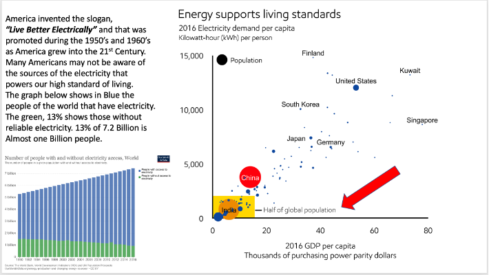 The first chart below is from a Power-Point presentation I prepared in 2016 for a course on energy and power generation at Williamson College of the Trades. This clearly shows the relationship of energy and economic prosperity as well as the relationship of energy to HMI.