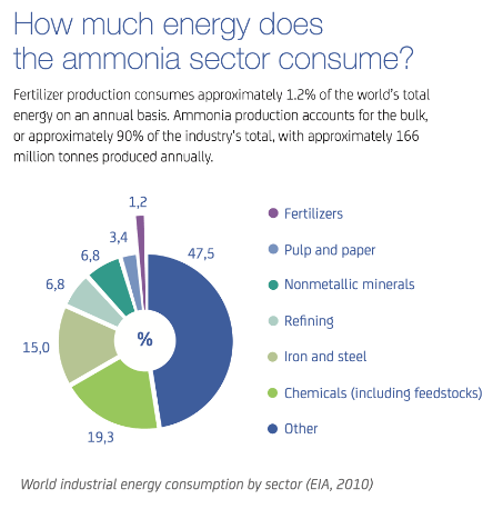 From Fertilizer Facts. https://www.fertilizer.org/images/Library_Downloads/2014_ifa_ff_ammonia_emissions_july.pdf. About 1.2% of the World’s Total Primary Energy is Used to Produce Ammonia: