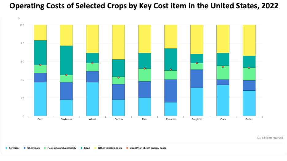 The IEA published a chart to show the cost components of energy for nine selected crops. The chart is copied below. Note that total energy cost for the nine selected crops range from a low of about 40% for cotton to almost 60% for wheat and sorghum, over 50% for corn. The cost of production for all food crops in the U.S. is about 50%. Most of this fuel is from fossil fuels. Energy is important for all of the people of the world and reasonable cost, abundant energy is crucially important for crop production and processing. Escalating energy costs will increase the costs of food and in some cases, reduce the quantity of food production due to limited fertilizer (ammonia based) availability. The fuel for Diesel tractors and food processing is significant. The final point: Solar and Wind cannot create fertilizer and both are impossible in the near term to power tractors and intercity or Global transportation.