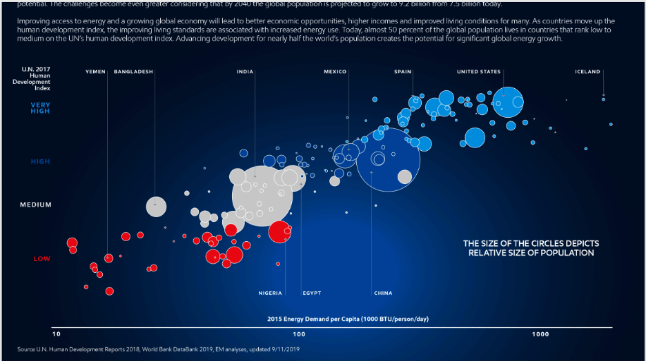 Another chart by ExxonMobil’s Energy Outlook in 2017, also captures the relationship of energy, HMI and economic prosperity. As quality of life (including adequate nutrition) goes up, so does the demand for energy.