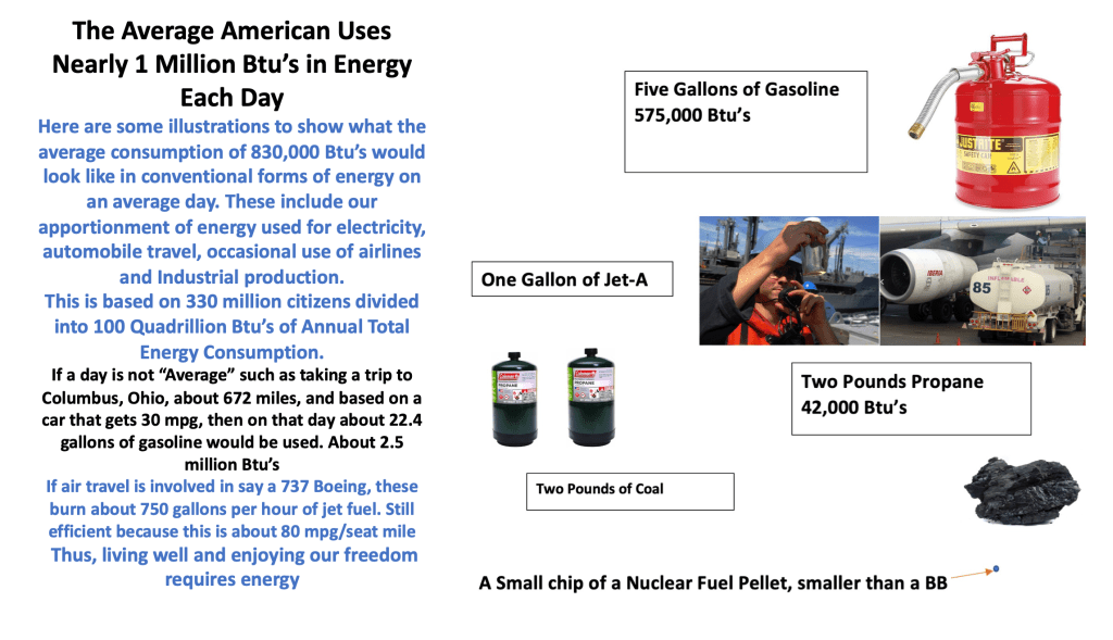 Many government officials contend that the best path to energy independence is through the use of renewable energy and in particular, they specify wind and solar. As has been reported before, wind and solar after many years of subsidies have produced less than 5% of America’s total primary energy. All energy use considered the per Capita use comes out to about 300 million Btus per person, per year. This is about 822,000 Btu’s per day, per person. Last spring I gave a presentation to our local Hilton Head Island Middle School students. One example I showed was how each of us in the room could use 822,000 Btu’s each day. I prepared the graphic below, which I attempted to make understandable for 8th Graders. Perhaps it is simple and easy to understand that even a Washington bureaucrat could understand? The folks making energy policy in Washington, in my opinion, do not understand how important conventional energy is to our way of life? Here below is my attempt to explain how using a million Btus/day is very reasonable for the average citizen.