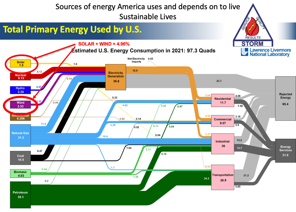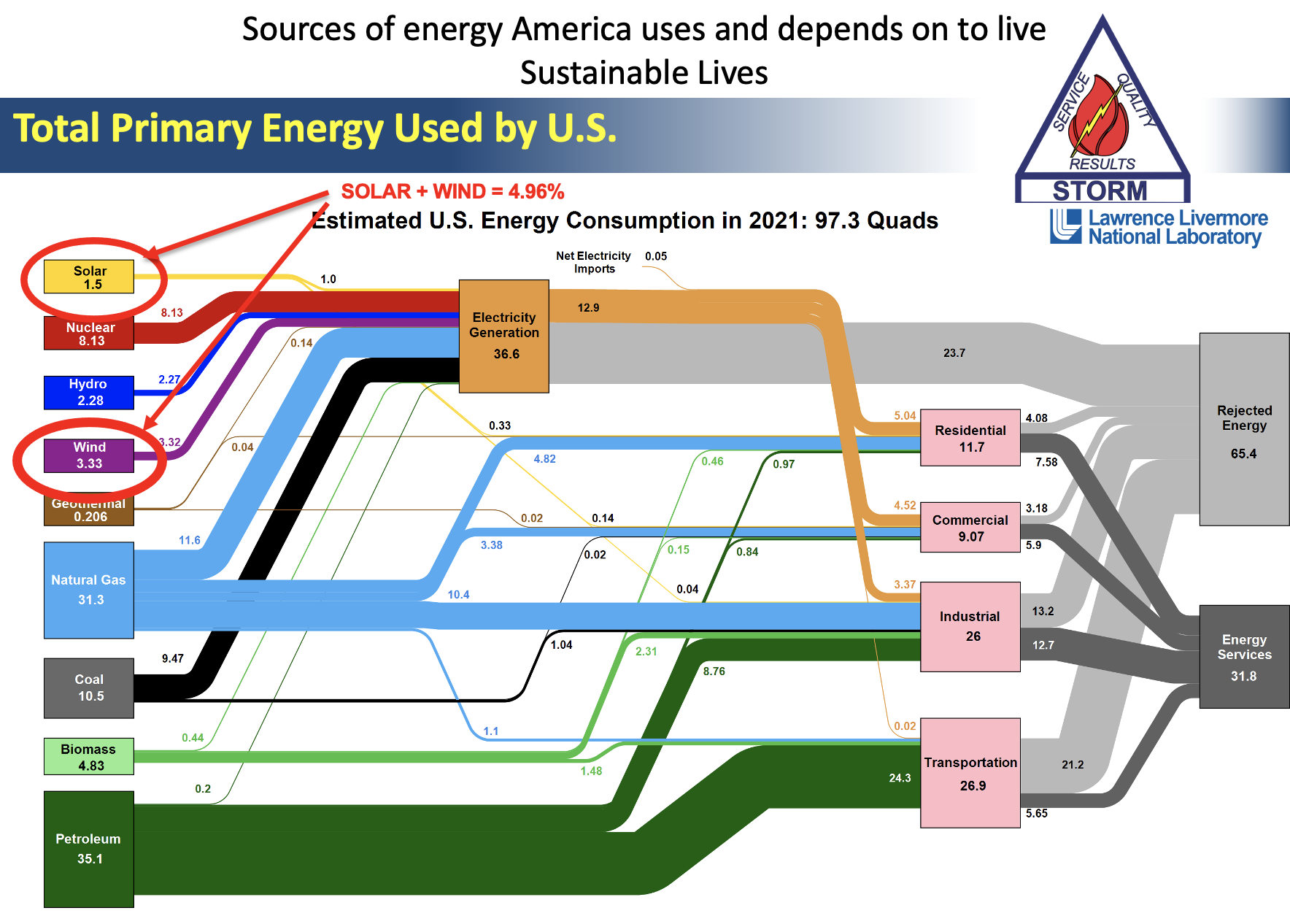 - Renewable energy from solar and wind cannot replace the total primary energy provided from conventional sources. An example is Hawaii which is not connected to the U.S. Grid, but adopted Green Policies much like the Green New Deal, thus Hawaii has the highest cost electricity of any state in our nation. See LLNL chart above. Solar and Wind together after decades of tax subsidies for incentives can only achieve 4.96% in 2021
