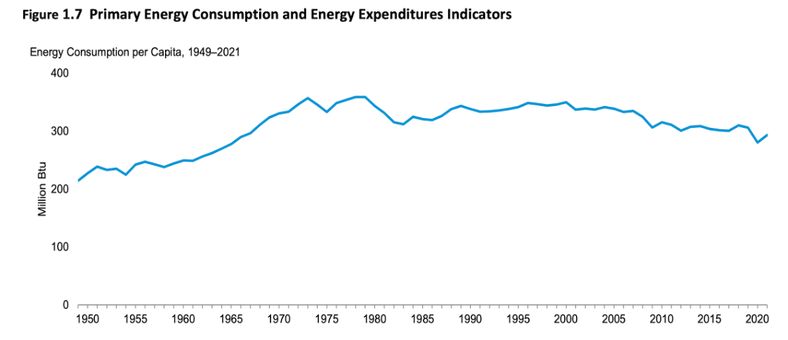 I have written before about the energy use per person for U.S. citizens being between 300 and 330 million Btus per year. The latest EIA Monthly Energy Report shows 293 million Btus per capita. I rounded up to 300 million Btus /Capita/year. When the recession is over, we will again exceed 300.