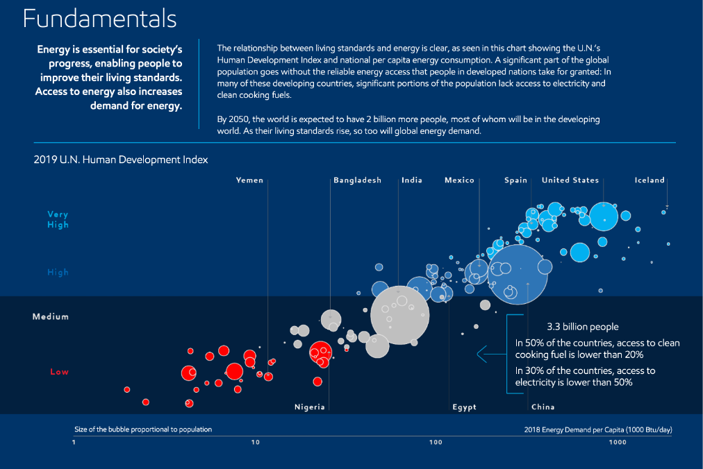 The Illustration below is available on the ExxonMobil(3) website and is based on U.N. data. Note that 50% of the world’s countries and 20% of the world population do not have fuel for cooking. I personally have experienced walking down the streets of cities in numerous Developing countries. I have witnessed heavy pollution which stings the eyes. Such pollution is not found in the U.S. Many Asian countries still use cow dung for indoor cooking.