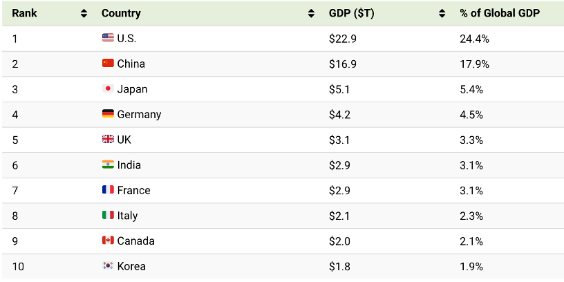 The total world GDP is projected to be 94 Trillion Dollars. Only 18 countries have greater than a 1% share of the total world economy. The U.S.A. and China comprise about 42%. The ten largest economies are: