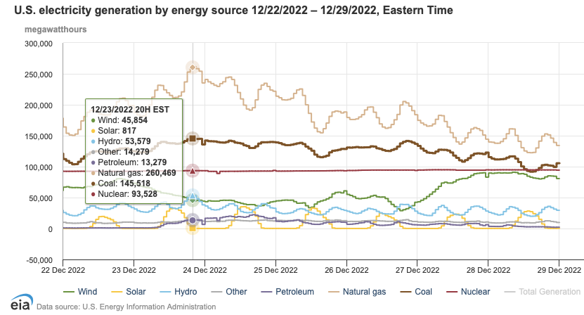 Here is the actual Bulk Power Generation by fuel for Christmas week 2022. Note that at the peak on Christmas eve, 80% of the total electricity generation was from conventional generation using natural gas, coal and nuclear fueled generation. Sixty five percent was from natural gas and coal, this does not fit well for Net-Zero Carbon and abolishing fossil fuels. This is reality. The Clean Energy Crisis is a manufactured crisis that should not have gone this far. Donn Dears has much to offer in his new book