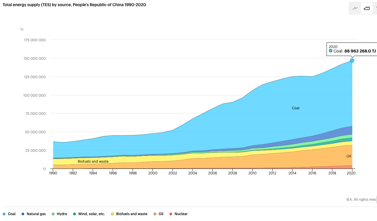 The total electricity generation (for China) by fuel from 1990 to 2020 is shown below. This is from the IEA statistics: