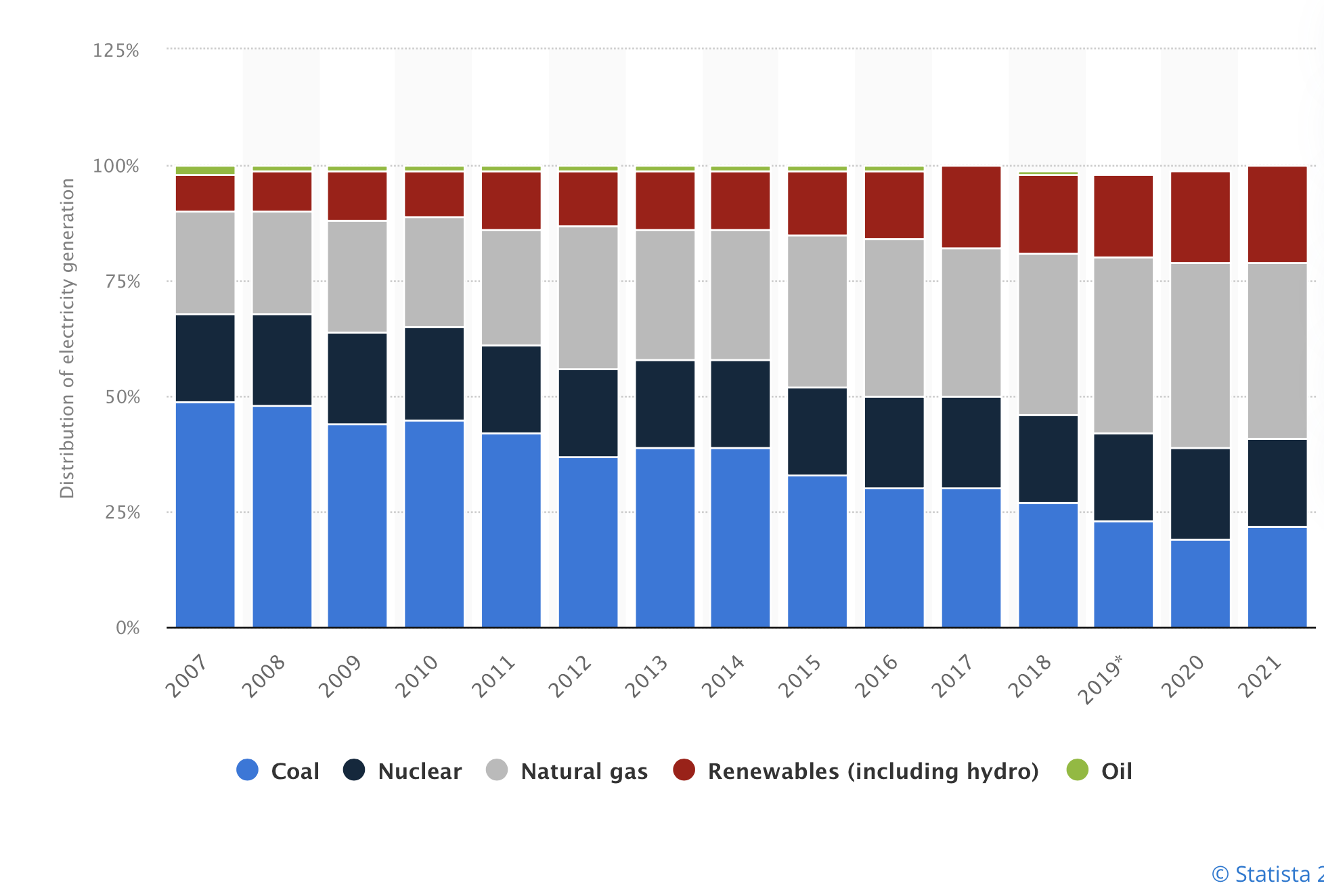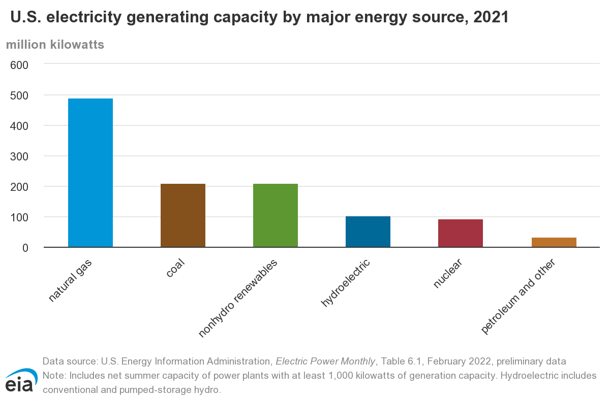 Comparing China’s fuel use for electricity production (above) to the U.S.A. (below). This is an overview of energy and electricity generation capacity in the U.S.A. in 2021 with natural gas being the largest fuel source.