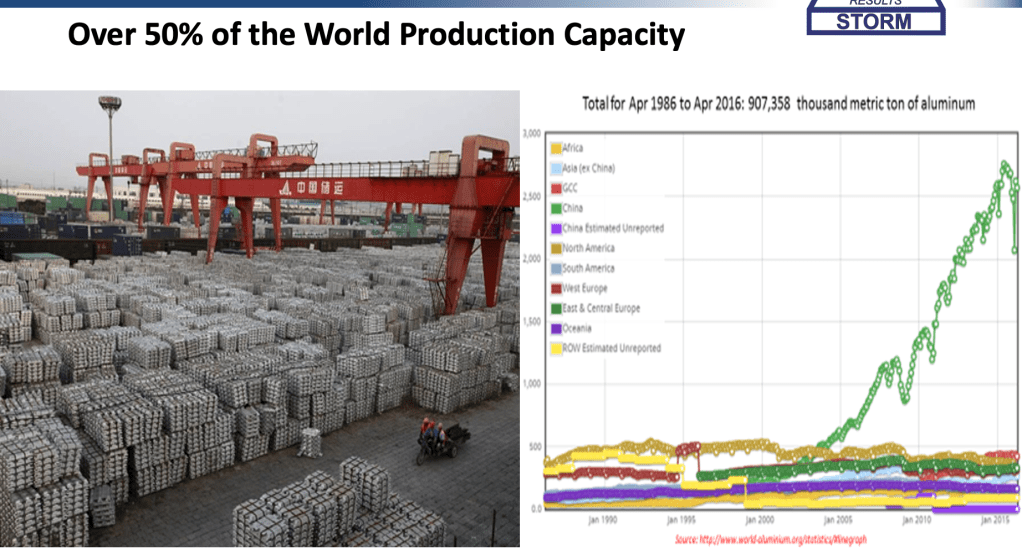 It is well documented that China is the world’s largest manufacturer of just about everything. This manufacturing might requires a lot of energy and electricity generation to power it. I first became concerned about the loss of American manufacturing (and jobs) with NAFTA in the 1990’s when my state of North Carolina lost most of the furniture and textile manufacturing. Then, after China entered the WTO (about 2001), the loss of American aluminum (and other industries) became very personal with me. I had worked as a Field Service engineer/Consultant on coal and oil power generation all around the world for ALCOA for 35 years (1977-2012). ALCOA during the 1980’s was the world’s largest alumina and aluminum manufacturer. After China was admitted to the WTO (World Trade Organization) the CCP promptly ramped up their aluminum production from insignificant production in the year 2000 to over 50% of world capacity by 2012. They produced aluminum at very low cost and then sold aluminum ingot (some would say, Dumped) on the London Metal Exchange. The figure below is from a Dick Storm presentation in 2016. The production data is from the International Aluminum Association and the WSJ. My Blog post in Feb. 2021 outlined some of my personal experiences in working for the power plant which powered the massive ALCOA Rockdale Smelting Works in Rockdale, TX.