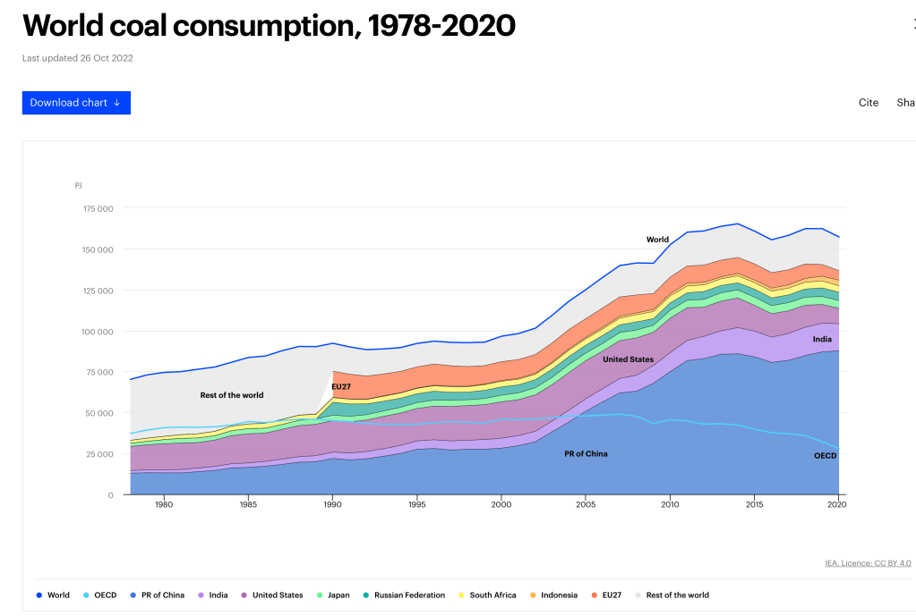 According to Carbon Brief.org, China is the world’s largest consumer, producer and importer of coal, with its consumption and production each accounting for around half of the global totals.