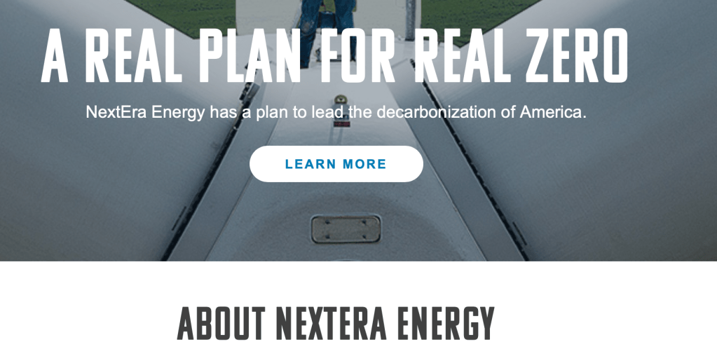This is a tall order. Better energy education of the public has been an idea I have had for at least two decades. When living in N.C. I did weekly “Energy Fact Minutes” on the radio with my old friend Matt Smith and also placed full page advertisements in the local Stanly News and Press newspaper. I have written to the CEO’s of several Utility companies, including Lynn Good of Duke Energy and the CEO of our Electric cooperative (Palmetto Electric) to suggest such energy education programs to be reinstated. The letters and message were ignored and in fact, not answered. Those Utilities and Coop’s are what I consider “Woke”…. and they are Promoting the myth of green energy instead of educating the public on the true facts of energy and electricity generation. Speaking of misinformation and “Wokeness” below is a screen shot from the NextEra Energy web site. A plan for Net Zero, really? Electrify everything? This and other once fine Utility companies have gone “Woke” and are promoting solar and wind power when they fully know it is not possible to replace the 100 Quadrillion BTUs that America needs every year. Why? Two reasons: 1. Follow the money through government subsidies and 2. Avoid the wrath of punishment of well funded (Billions of $) environmental extremist groups. Below is a screen print of the NextEra Energy website as an example.