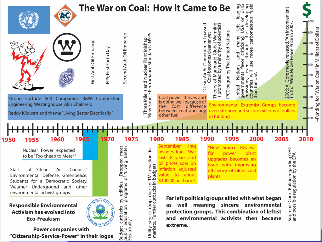 The point of the graphic was to show how the progression of the perceptions of coal power by the public from the time line of 1950 to 2008. In the 1950’s, 1960’s and 1970’s “Living Better Electrically” was the theme promoted by the MSM and in public schools. Also, the funding for TV, magazines and newspaper advertising was generous by such Fortune 500 companies as General Electric, Westinghouse, Allis-Chalmers, Babcock and Wilcox, Combustion Engineering and many more. One of my favorites by B&W is shown below.