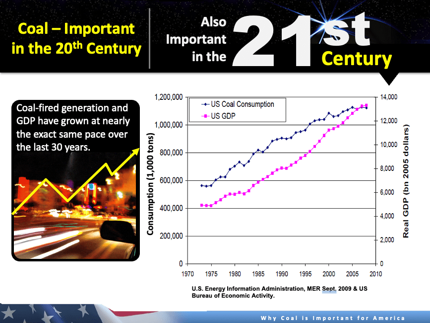 This post was started a couple months ago and after I was thinking about “What is a positive approach to correct the indoctrination?” The solution to the problem (Self Sabotaging Madness) is Energy Education of the public. Those of us folks who were born before 1950 remember the Public Utilities energy education programs from the 1950’s through the 1970’s “Living Better Electrically”. One example is the Sunday night TV program, “General Electric Theatre” showcased by none other than future President, Ronald Reagan as a spokesperson for G-E, to showcase new electrical appliances that were making a Mother’s work easier and living better electrically a reality for all Americans(4). Reddy Kilowatt was the mascot for the programs by the Investor owned Utilities. Living better electrically was shown on TV, electric bill inserts, newspapers and perhaps more importantly, in public schools. Local electric Utilities had regular programs in High Schools to teach not only Home Economics and how to cook using electric stoves, for the girls, but also “How Electricity is Generated” for the boys. I know, today that sounds wrong and politically incorrect, but back when we referred to Boys and Girls. People also had a better understanding of where our electricity came from. In fact, I was one of them that as a 16 year old (in 1959), I became enamored with coal power generation. A true fact. And I was not exactly a standout scholar, but I knew how electricity was generated as a teen. Here is a reminder of the correlation of GDP and coal consumption 1970-2010. (148)